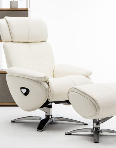 Ultra-modern 360-degree swivel pedestal chair with auto return, adjustable headrest, adjustable ottoman and angled pillow arms. The adjustable headrest has tilt forward range of up to 40 degrees and height adjustment of up to 2 inches. Knob controlled manual recline allows you to recline 115 degrees to 160 degrees. The