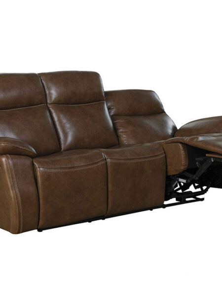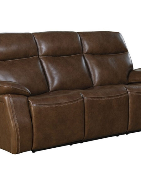 Relaxed contemporary styled reclining sofa, console loveseat and chair have power recline with power headrests, split pub back design, pocketed coil bucket seating, and foam pillow arms. The back, seat fronts, and arms are accented with decorative stitching. Each power controller has a USB port.