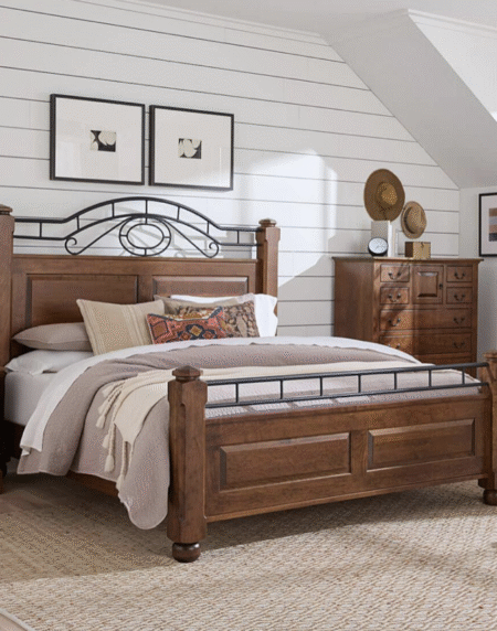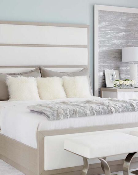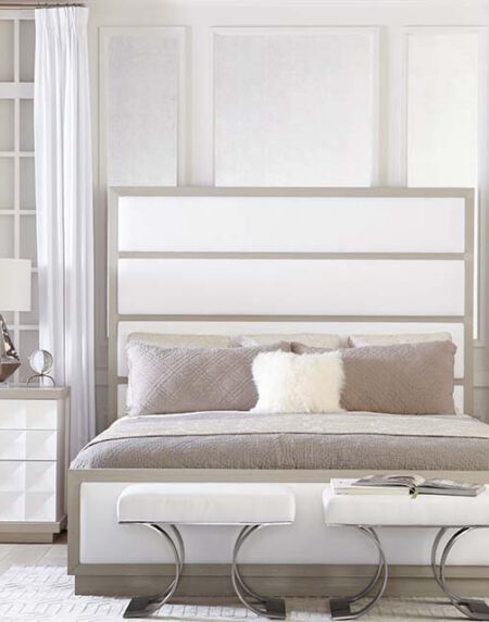 Domaine Blanc is a neo-traditional collection where classic forms are updated with subtle flourishes. A Dove White finish is found on sandblasted oak veneers, creating a juxtaposition between a casual finish and traditional forms. Tarnished Nickel used on hardware and metal offers brightness, while White Quartz provides an elegant accent.