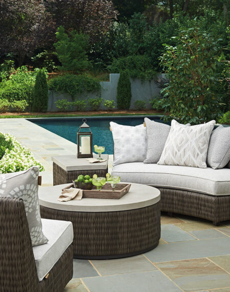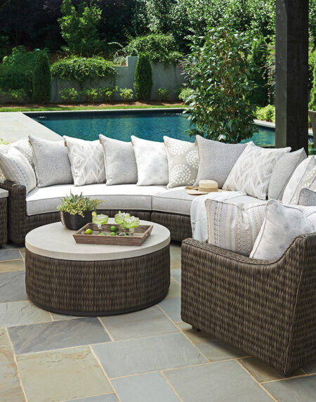 We proudly carry the Cypress Point Ocean Terrace collection by Lexington Homebrands. The collection features a sophisticated V-pattern of all-weather woven wicker including aluminum frames and a custom aged iron finish. This collection has a neutral palette and layers configurable performance fabrics to accentuate your outdoor space. This collection is available